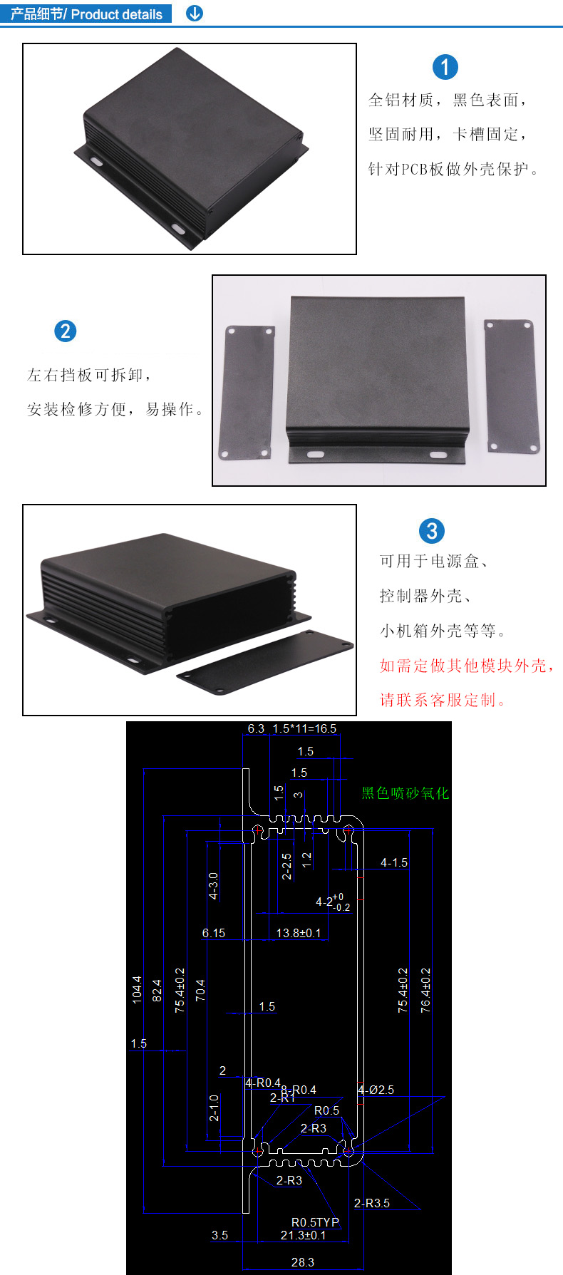 特點(diǎn):1.全鋁材質(zhì),黑色表面,堅(jiān)固耐用,卡槽固定,針對PCB板做外殼保護(hù)。